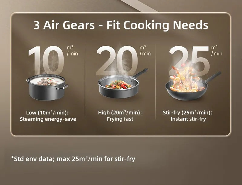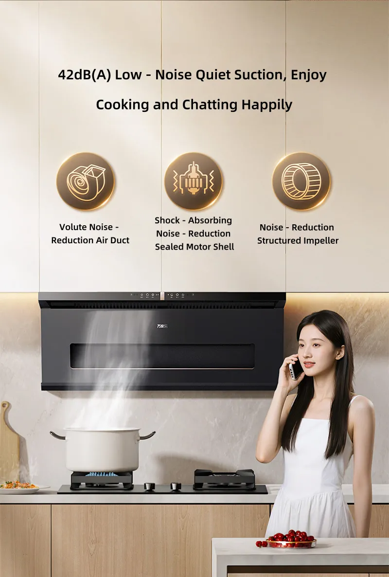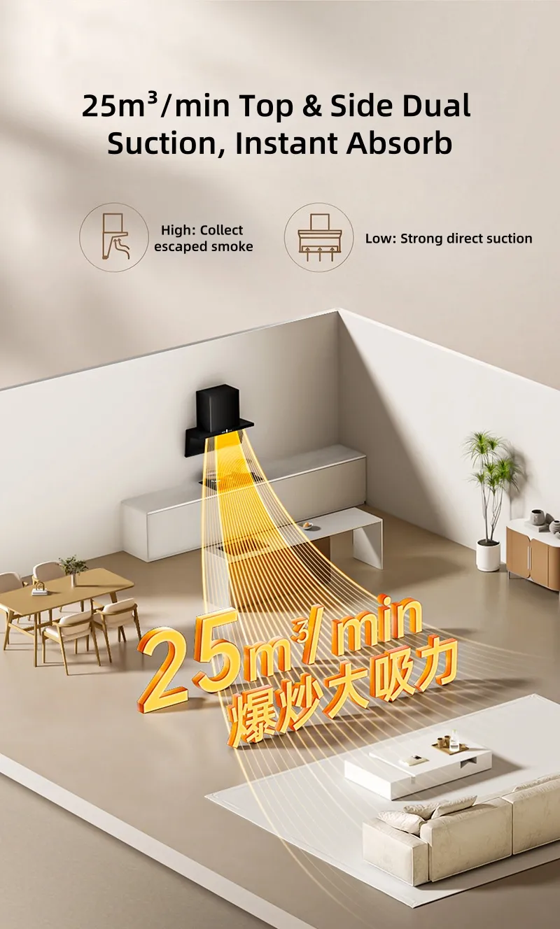 This range hood boasts DC variable - frequency power for strong, smooth suction - exhaust. With 25m³ stir - frying air volume, 1000Pa static pressure to break flue resistance, it ensures instant oil - fume removal. Top - side dual suction enables flush cabinet mounting. Linked with stoves, it auto - starts. Nano - coated impeller self - cleans. Low - noise operation, three air - volume gears for diverse cooking, plus a large oil cup cutting dumping frequency, making it a smart, efficient kitchen helper.
