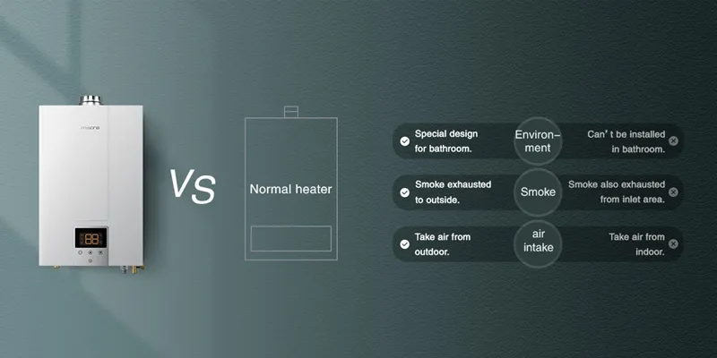 A forced-draft gas water heater uses a fan to exhaust combustion gases to the outside. It requires an exhaust flue connected to the outside. In contrast, a balance-type gas water heater has a sealed combustion chamber. It draws in outside air for combustion and exhausts gases outside through a coaxial flue. This makes it safer for installation in areas with limited ventilation, as it doesn't consume indoor air for combustion.
