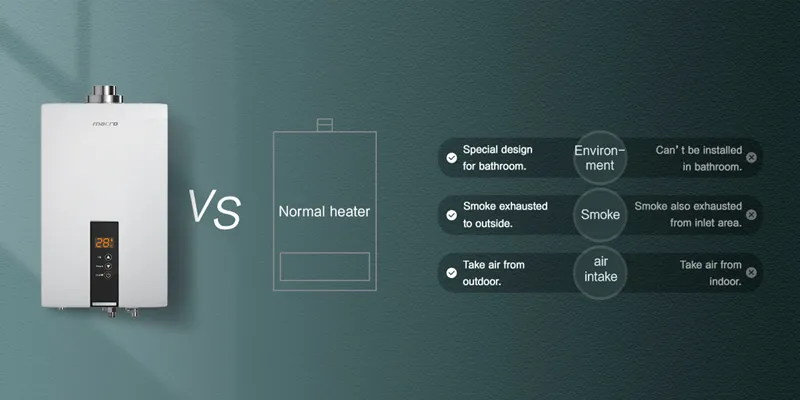 A forced-draft gas water heater uses a fan to exhaust combustion gases to the outside. It requires an exhaust flue connected to the outside. In contrast, a balance-type gas water heater has a sealed combustion chamber. It draws in outside air for combustion and exhausts gases outside through a coaxial flue. This makes it safer for installation in areas with limited ventilation, as it doesn't consume indoor air for combustion.
