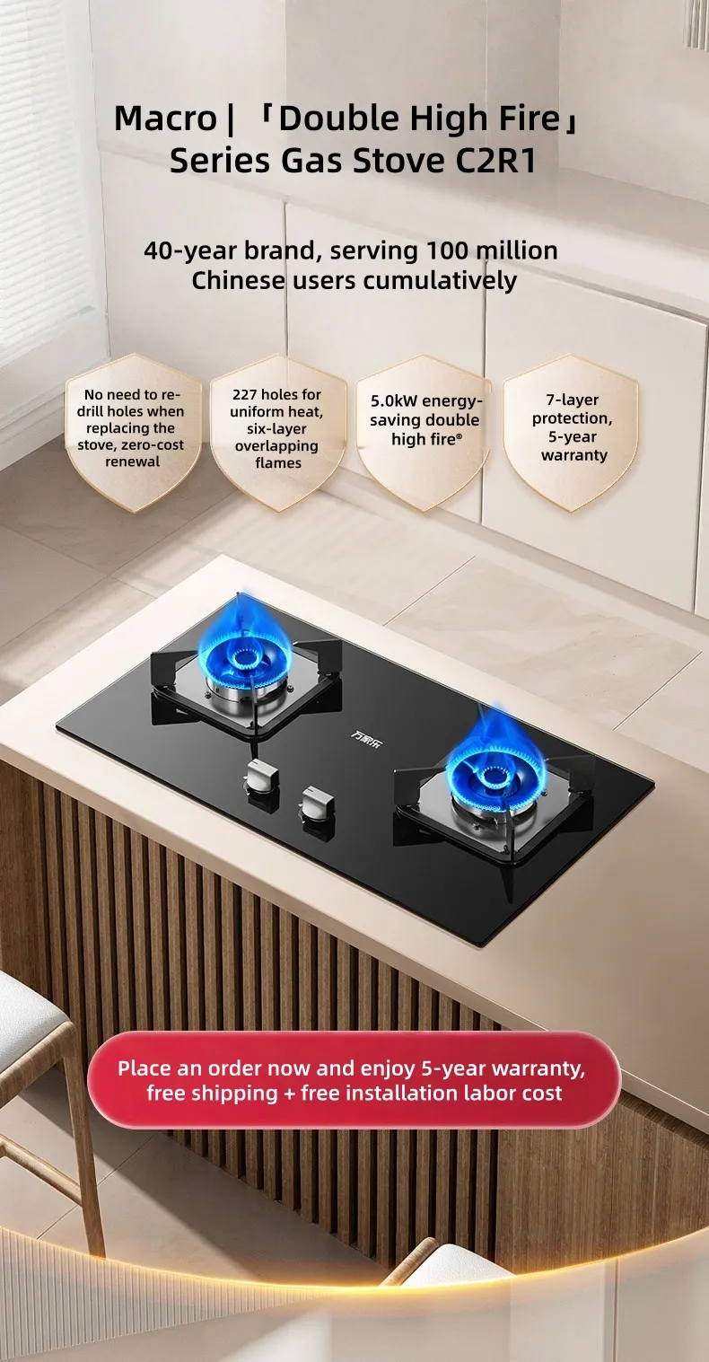 The Macro 「Double High Fire」Series Gas Stove C2R1 is a high-performance appliance with 5.0kW dual high fire for fast, efficient cooking. It features 227-hole overlapping flames, flexible installation without re-drilling, 0-wait ignition, and 7-layer safety protection. With easy-to-clean design and durable components, it’s ideal for both old and new homes.
