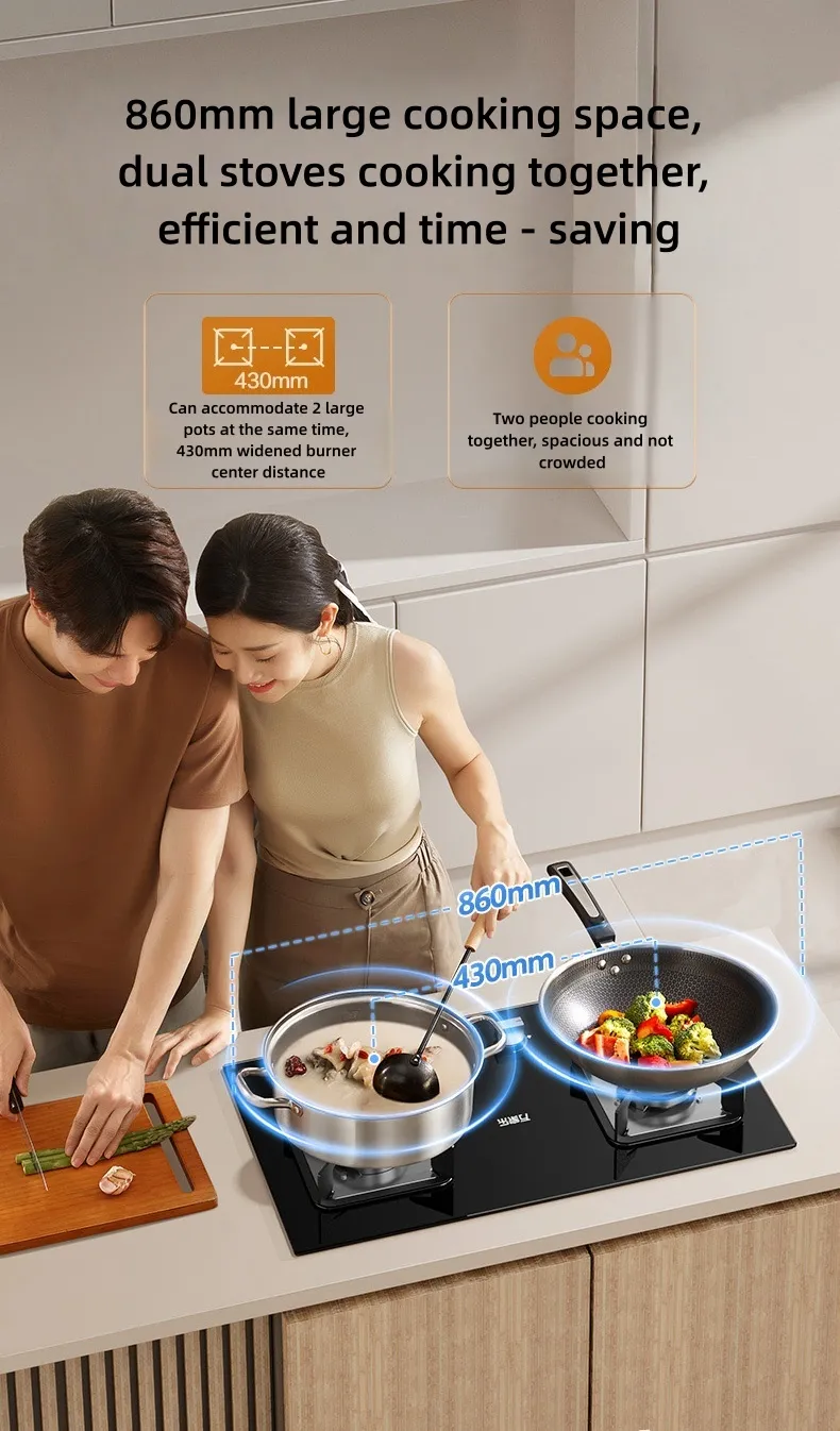Can accommodate 2 large pots at the same time, 430mm widened burner center distance