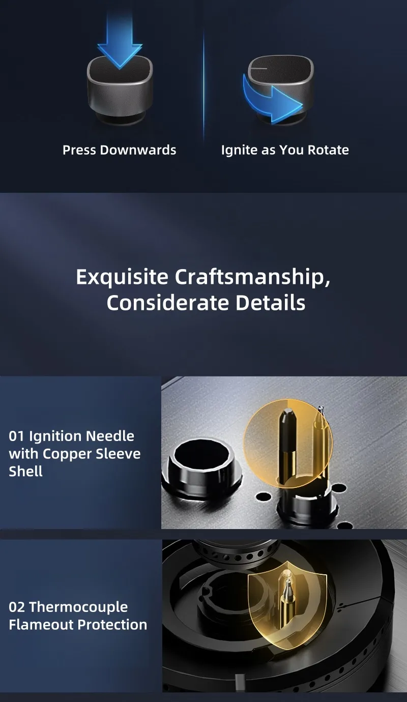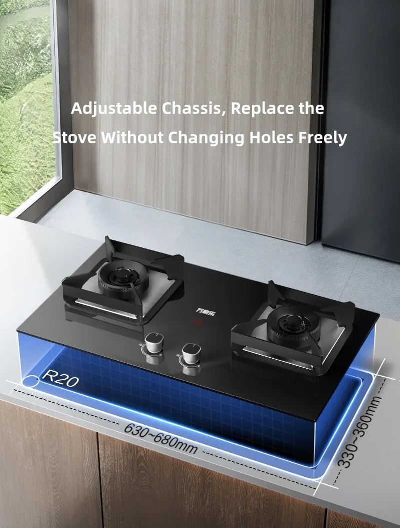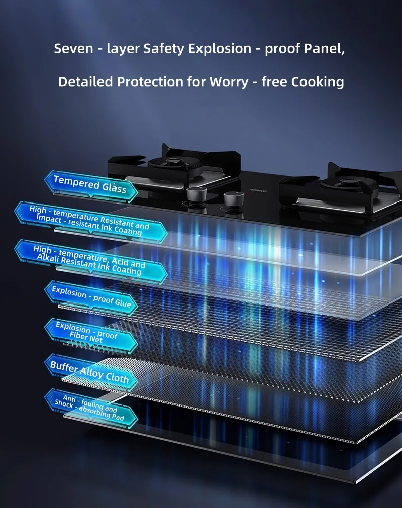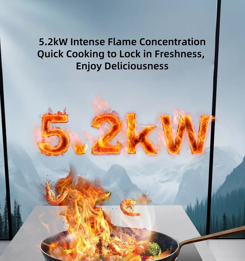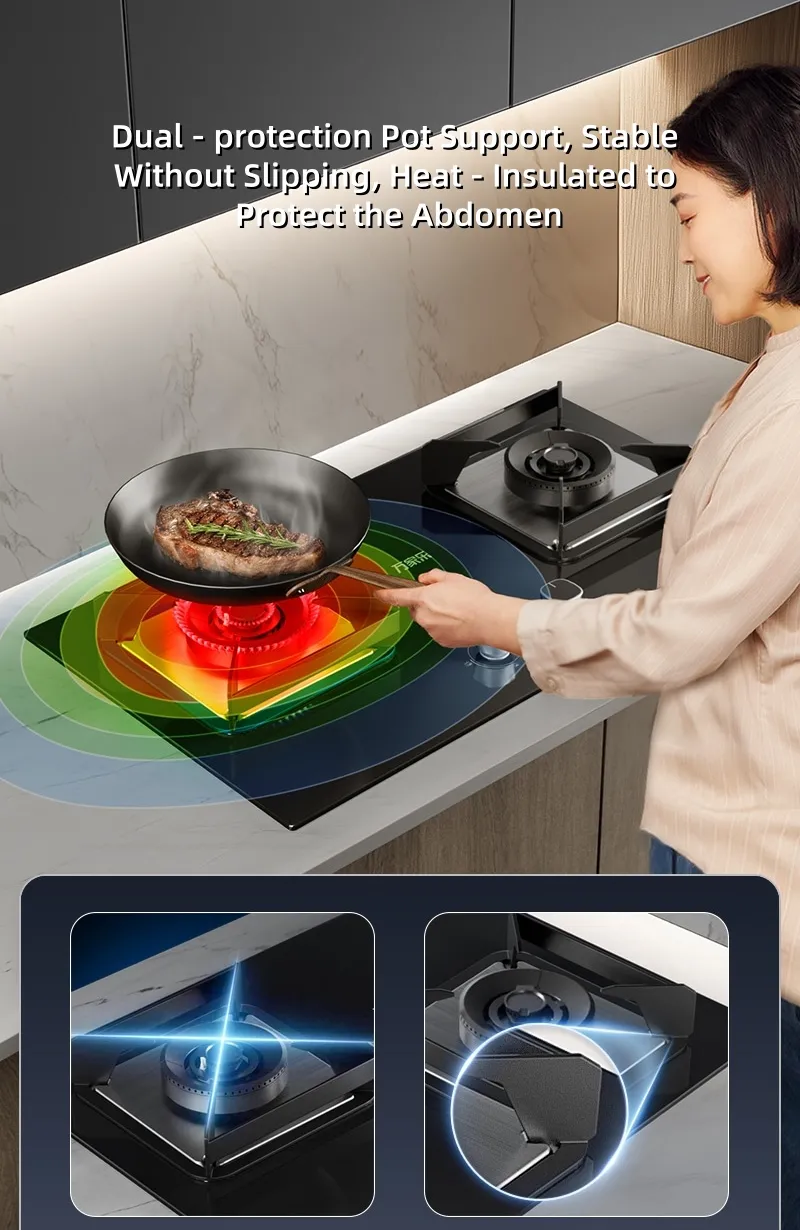 This gas stove boasts 5.2kW strong firepower and 65% Level 1 energy efficiency, ensuring high efficiency and energy savings. It adopts the innovative flow - guiding ring technology (patent pending), which distinguishes and guides the air for outer and central flames again, enabling precise oxygen supply and more uniform gas mixture. With a mechanical flow control valve, it allows 240° wide - angle stepless adjustment of fierce and gentle fire, for accurate firepower control.