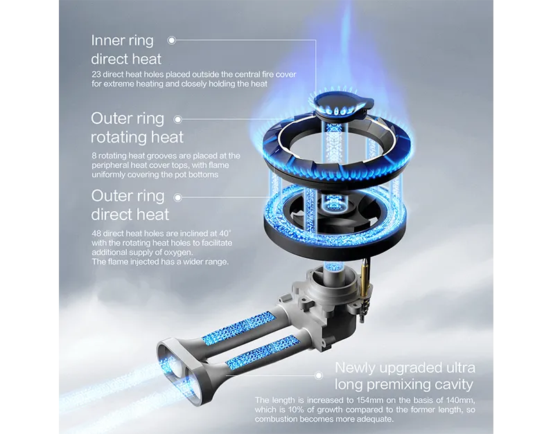 Newly upgraded uniform flame burner for locking freshness, with inner ring heated by direct fire and outer ring heated by rotary fire.
