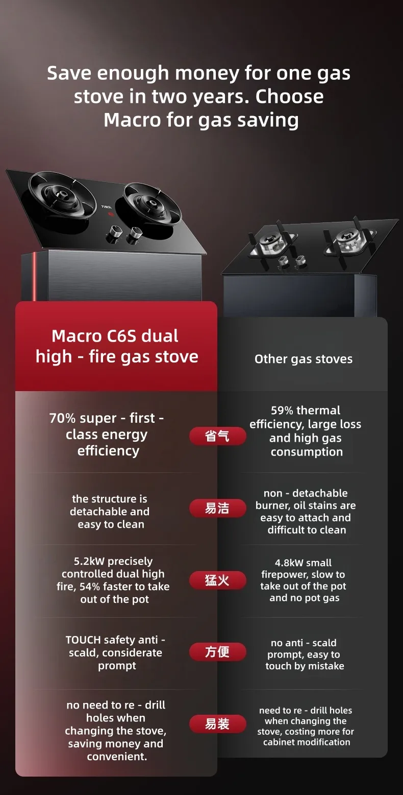 English:Macro C6S dual high - fire gas stove has 70% super - first - class energy efficiency, super gas - saving, saving 3,000 yuan in 8 years;