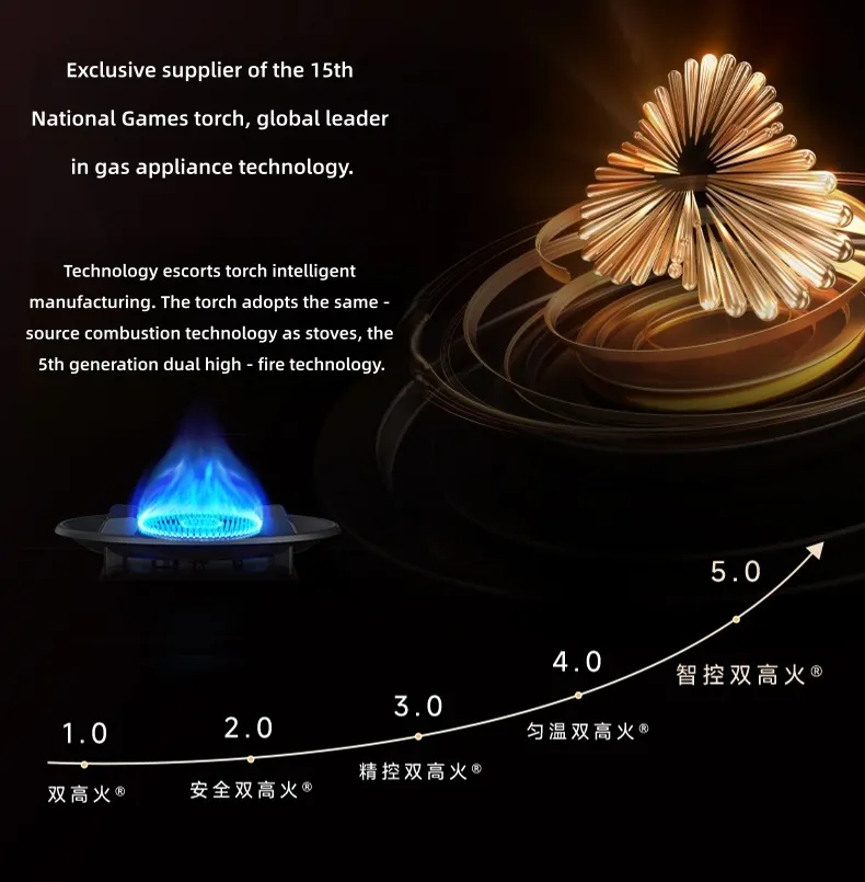 中文:科技护航火炬智造,火炬采用灶具同源燃烧科技,第 5 代双高火技术。