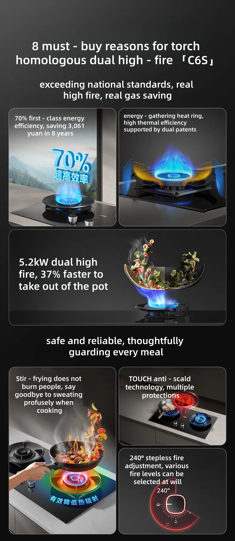 中文:「小飓风」双高火燃气灶 C6S,节能新高度,烹饪高速度,超国标,真省气,70% 超高效率,5.2kW 高火力。