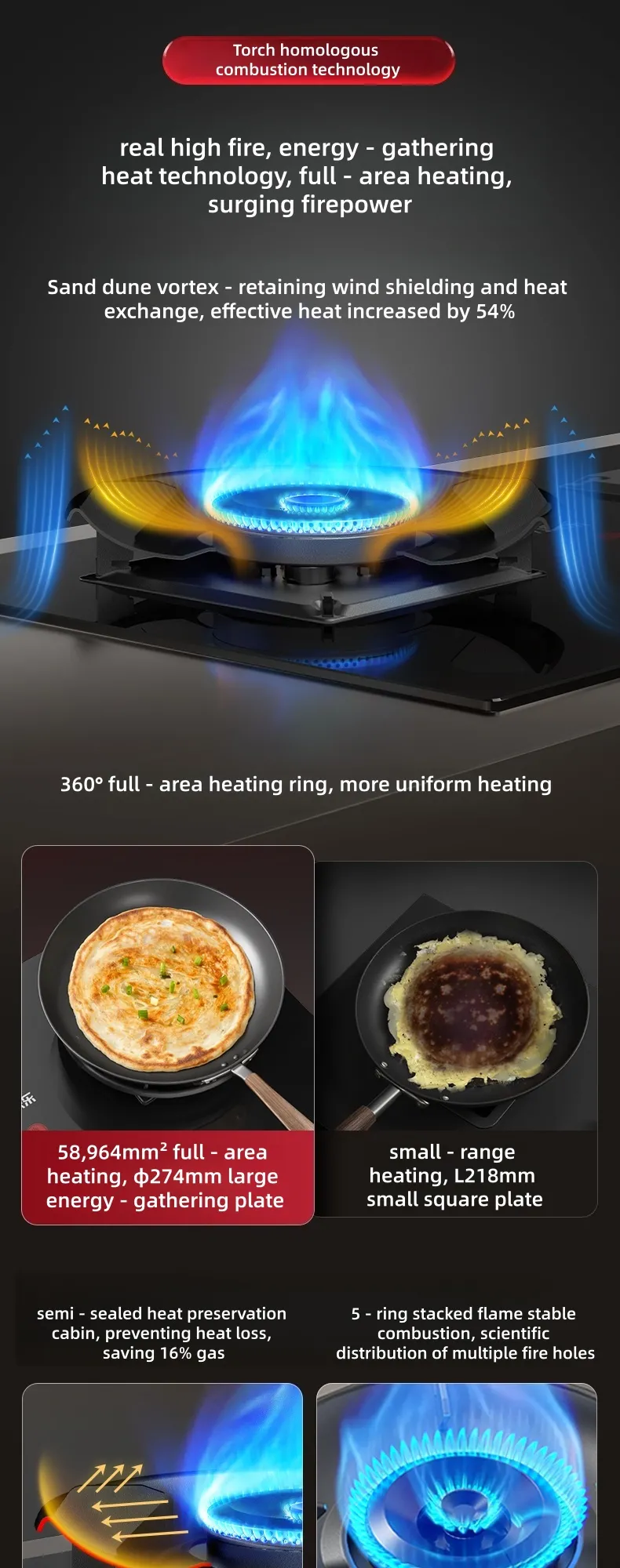 English:Torch homologous combustion technology, real high fire, energy - gathering heat technology, full - area heating, surging firepower.