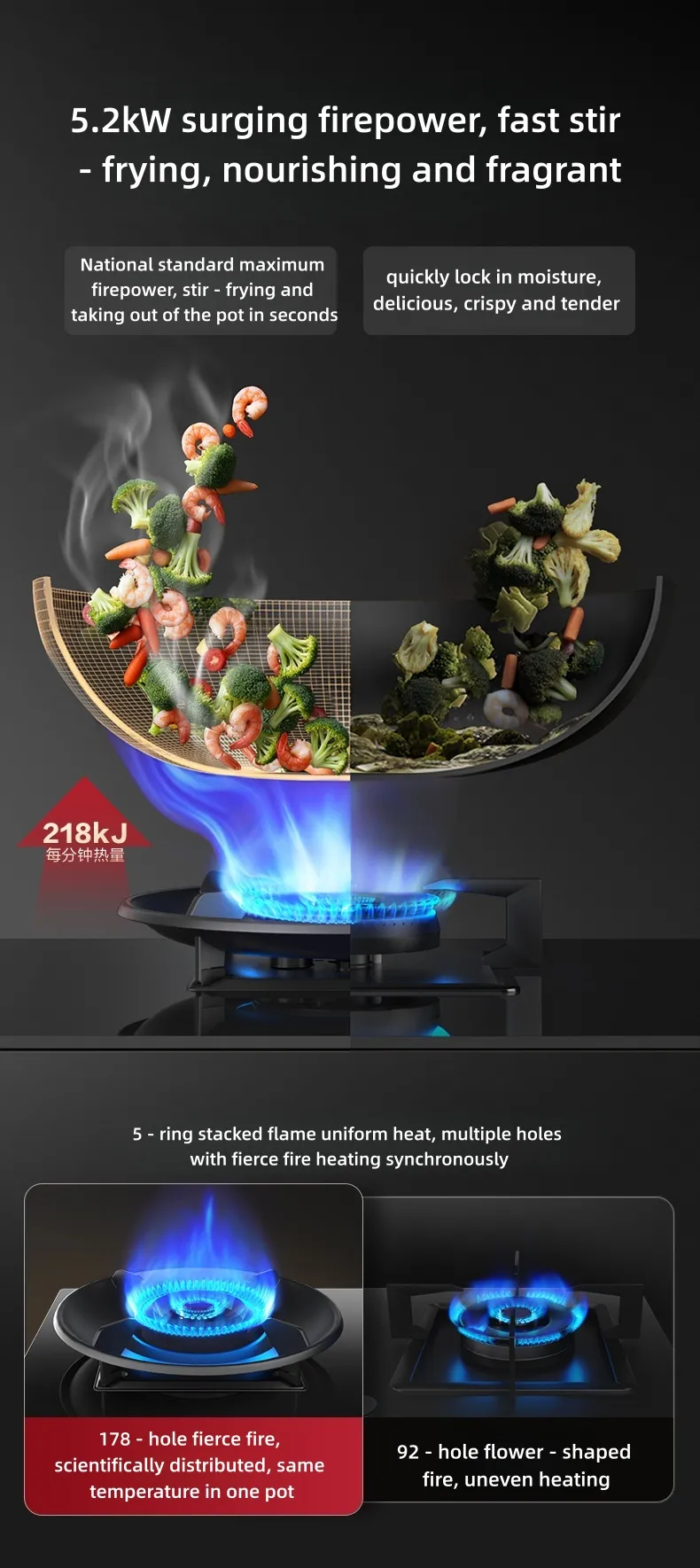 English:It can realize various firepower adjustments such as flavorful braising, tender and fragrant frying, amazing 5.2kW stir - frying, nutritious quick steaming, crispy frying, home - style stir - frying, fresh and fragrant roasting, essence soup cooking, concentrated slow stewing, and 0.5kW warm heat preservation.