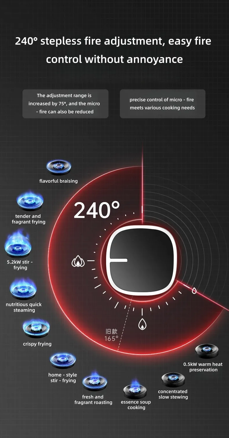English:240° stepless fire adjustment, various fire levels can be selected at will.