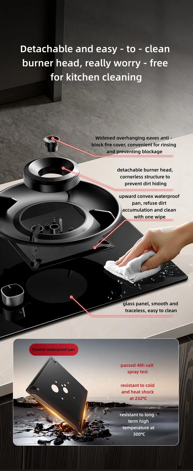 English:detachable burner head, cornerless structure to prevent dirt hiding;