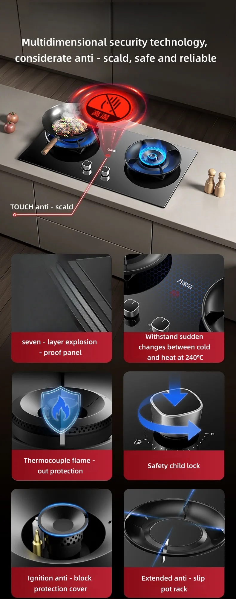 The Macro dual - burner gas stove boasts remarkable features. It has a 760mm large cooking space for efficient double - stove cooking. With 5.2kW dual high fire and 70% super - first - class energy efficiency, it saves gas. Equipped with multidimensional security tech like TOUCH anti - scald and seven - layer explosion - proof panel, it ensures safety. Also, details such as anti - slip knobs and full air intake enhance user experience.