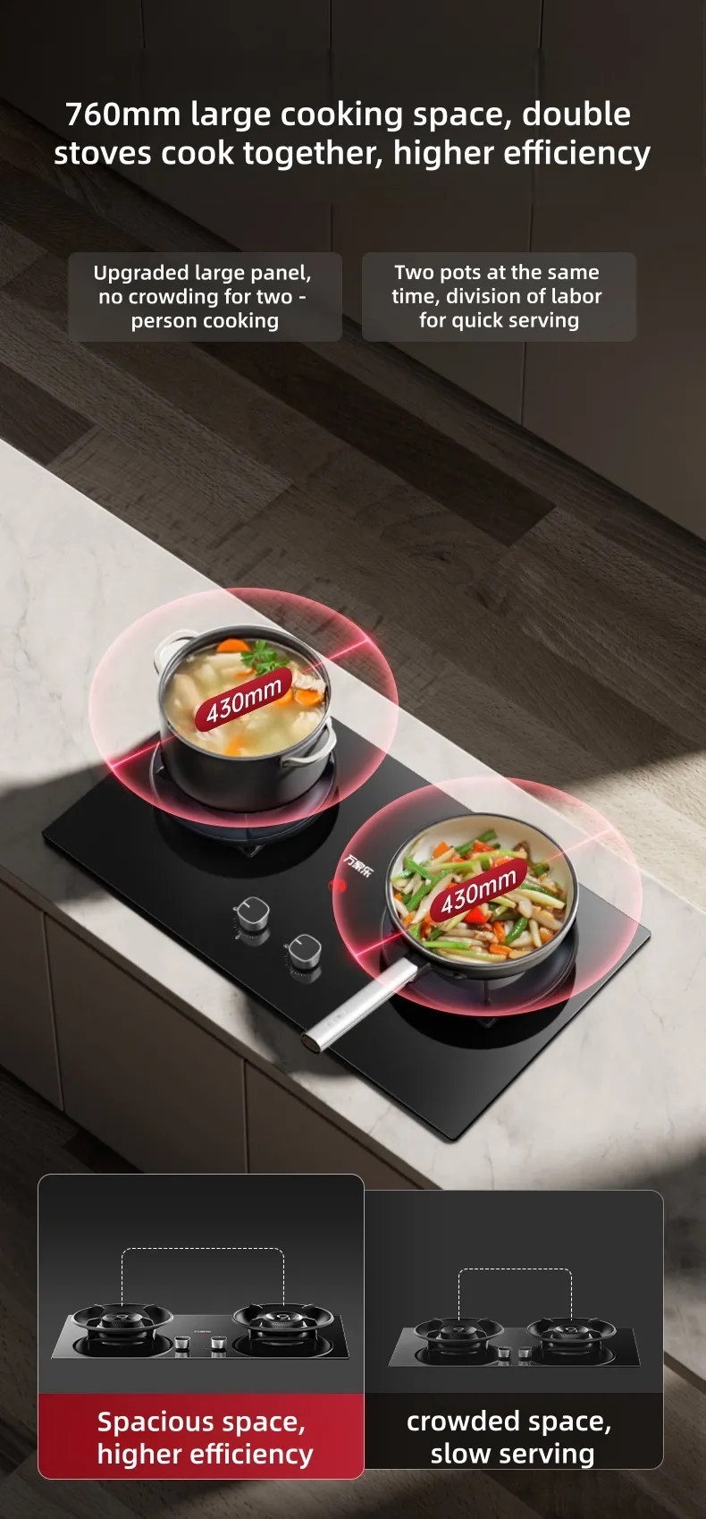 English:760mm large cooking space, double stoves cook together, higher efficiency.