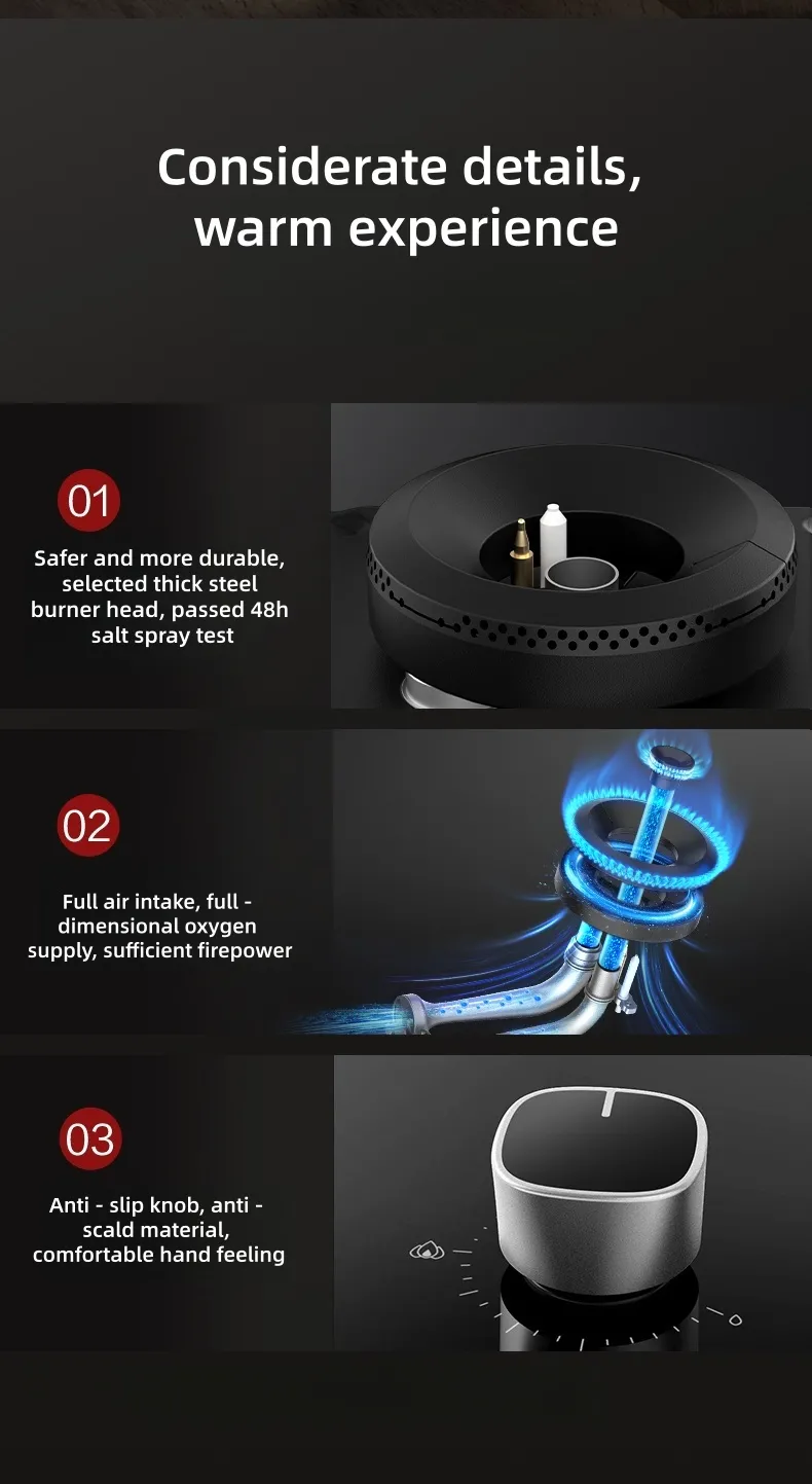English:Safer and more durable, selected thick steel burner head, passed 48h salt spray test.