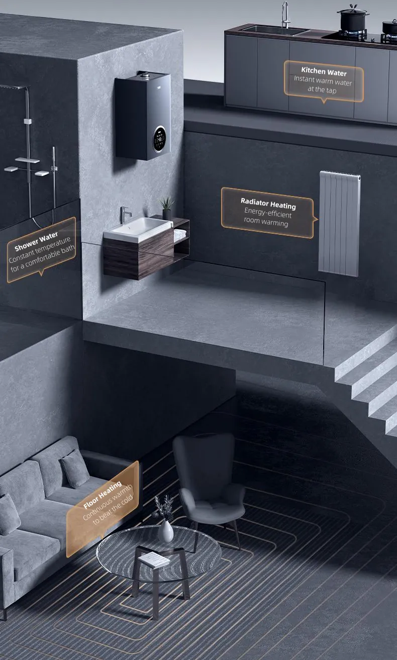 Multi-scenario application: one device for heating, showering and kitchen water supply. All-in-one flexibility:smart control for cost & energy savings