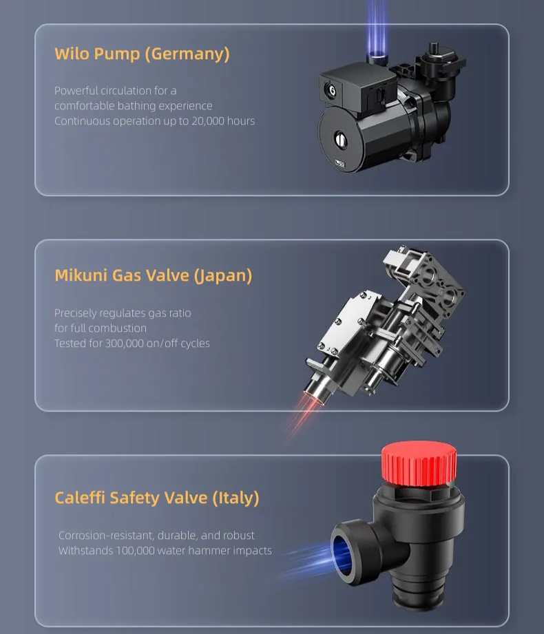 At its core, the R5L Series features a plate heat exchanger paired with a German Wilo circulation pump and a Japanese Mikuni gas valve, ensuring optimal heat transfer, precise gas regulation, and reliable performance even under heavy use. The boiler’s forced ventilation system and IPX4D protection rating make it safe for installation in bathrooms and other humid environments, while its 48 layers of safety protection—including anti-freeze, anti-dry burn, and pressure relief features—provide round-the-clock peace of mind.