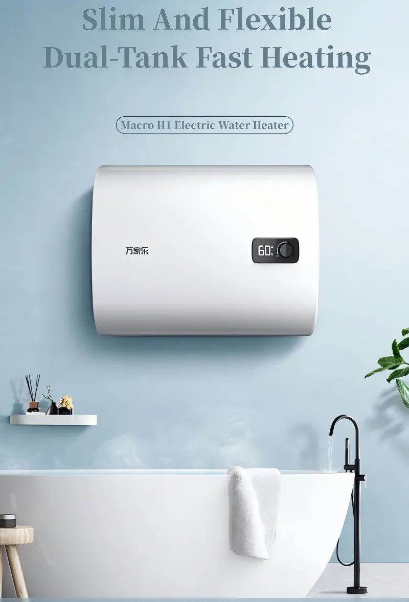 The H1 electric water heater combines a sleek, space-saving design with dual-tank rapid heating and 80% hot water output.