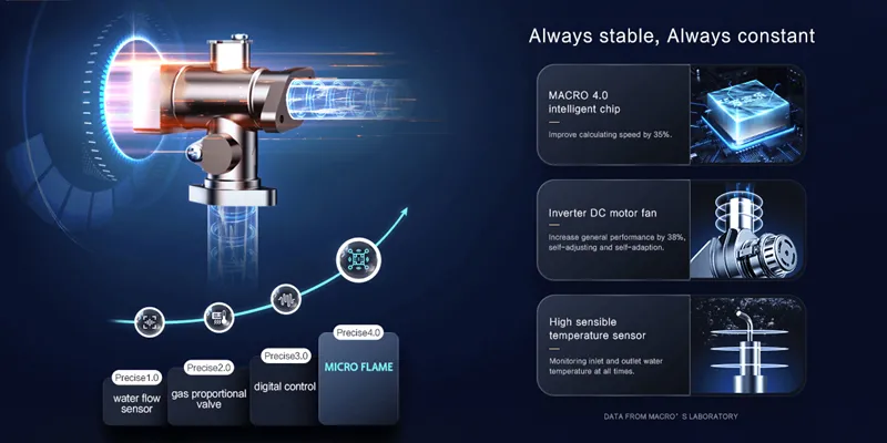 Integrated with 3 core control components, realize optimal gas and water match, precisely static and dynamic control, keep hot water always stable.