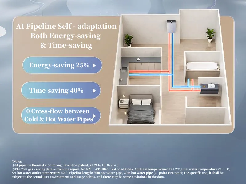 Enjoy instant hot water with zero-cold-water function (single-use, touch-activated, or scheduled modes) and AI Pipe Adaptation that enables half-pipe preheating to save time and gas. The Dual Water-Gas Pressure Boost guarantees strong flow with one-touch temperature locking, while Multi-Stable Combustion Technology (Zero Fluctuation Ignition, Micro-Flame Control, and Smart Temperature Sensing) delivers uninterrupted comfort.
