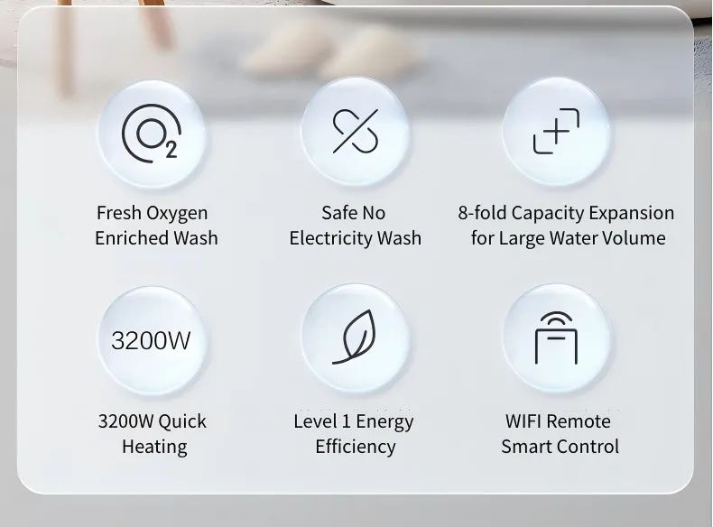 A 3200W heating tube and smart capacity boost provide 8x more hot water (equivalent to 480L), ideal for families. The oxygen-rich bathing tech infuses water with air bubbles for softer, skin-friendly showers.