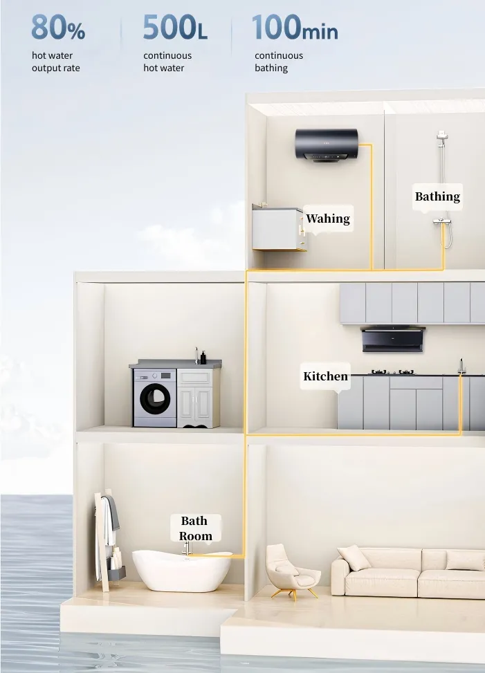 It meets hot water needs anytime, providing a surging 500L water volume,