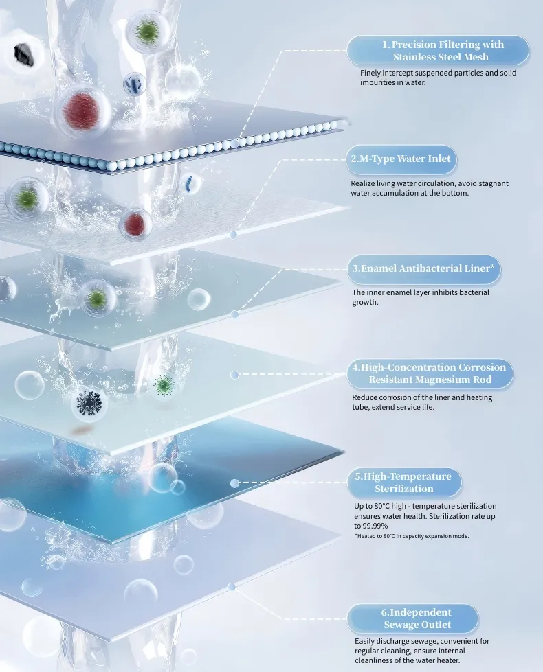 6 Purification Layers: M-shaped water flow + high-temperature sterilization.