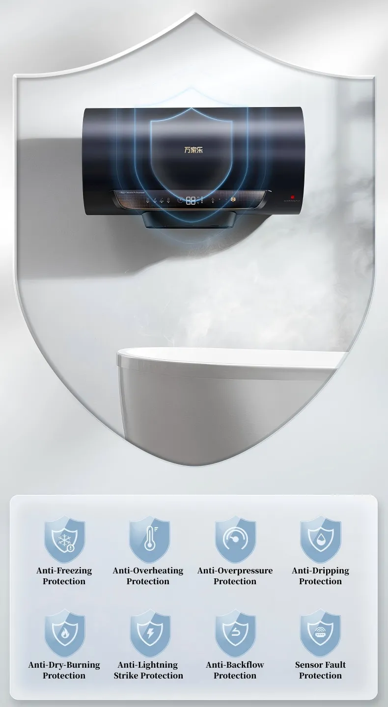 Eight safeguards cover over-temperature, pressure surges, lightning strikes, dry-firing, and more. An 8-year warranty underscores durability.