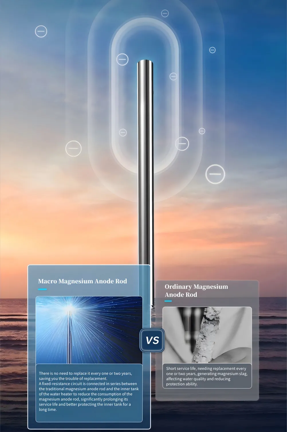 It resists scaling around the clock to slow down the consumption rate of the magnesium anode rod, durably protects the health of the inner tank, and enables you to enjoy the lifetime maintenance-free benefit of the magnesium anode rod.