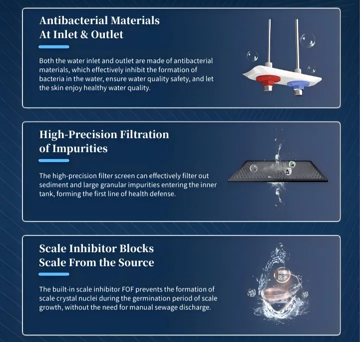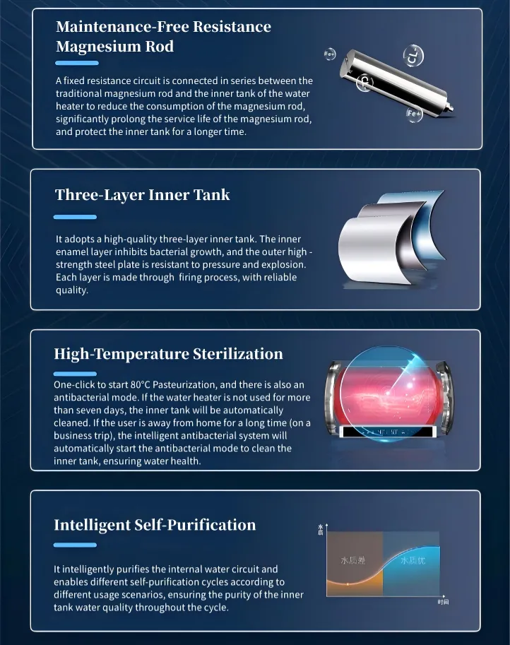 Safety is guaranteed by 7-fold protection, including anti-freezing, over-temperature, over-pressure, dripping, dry burning, lightning strike, and sensor fault protection. For health, 7 - fold purification is available, with high - concentration magnesium rods, enamel liners, silver ion sterilization at water inlets and outlets, stainless steel filters, M - type living water, independent sewage outlets, and built - in scale inhibition.