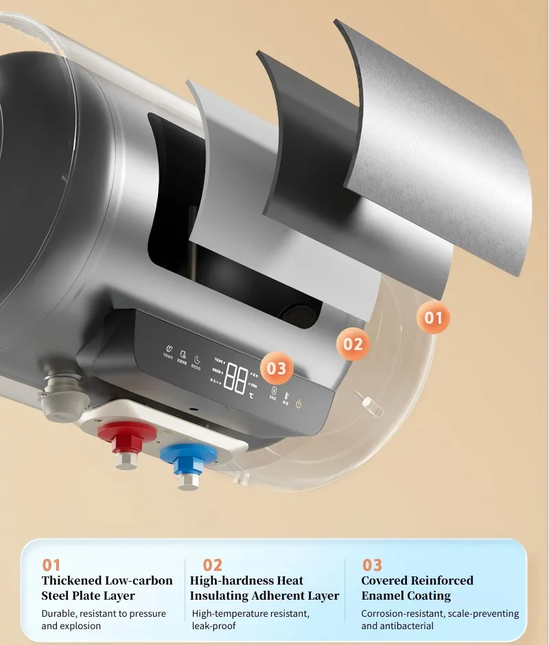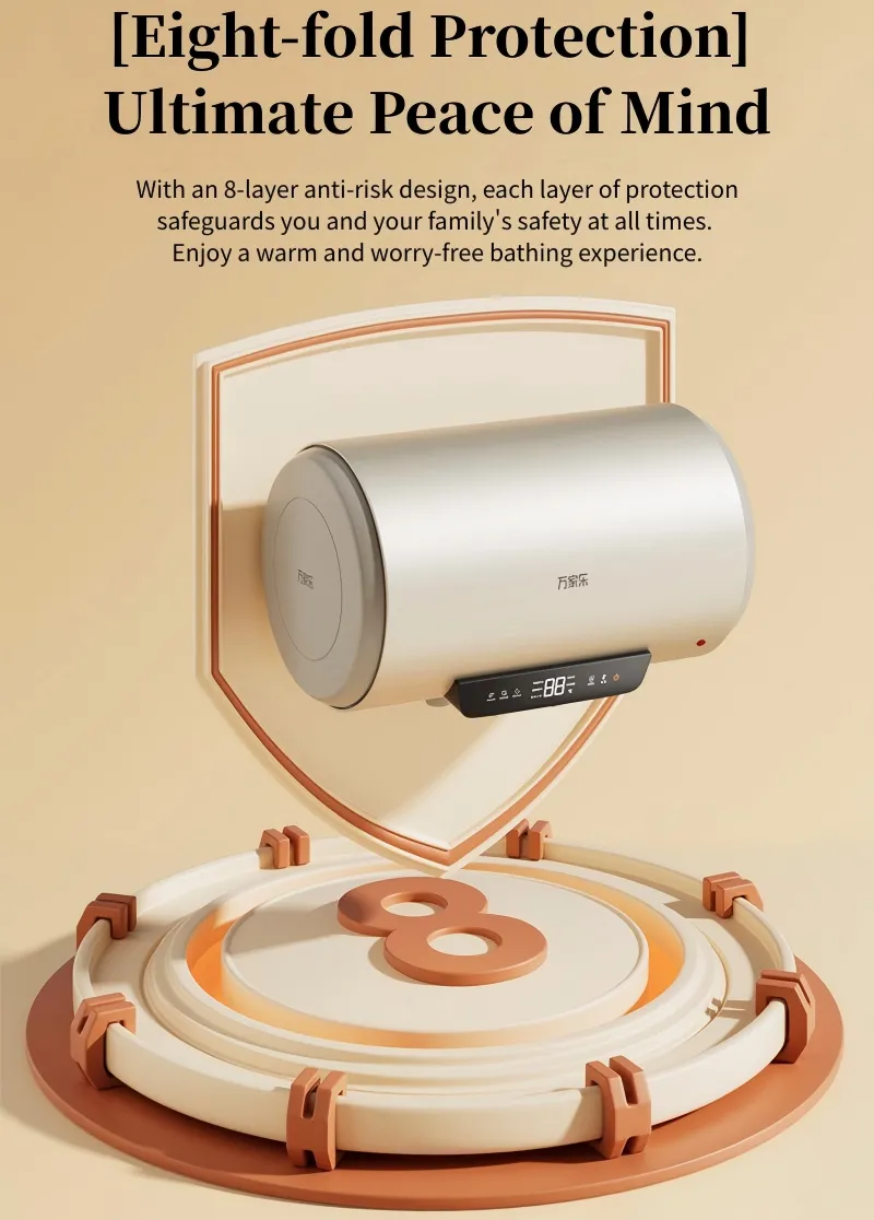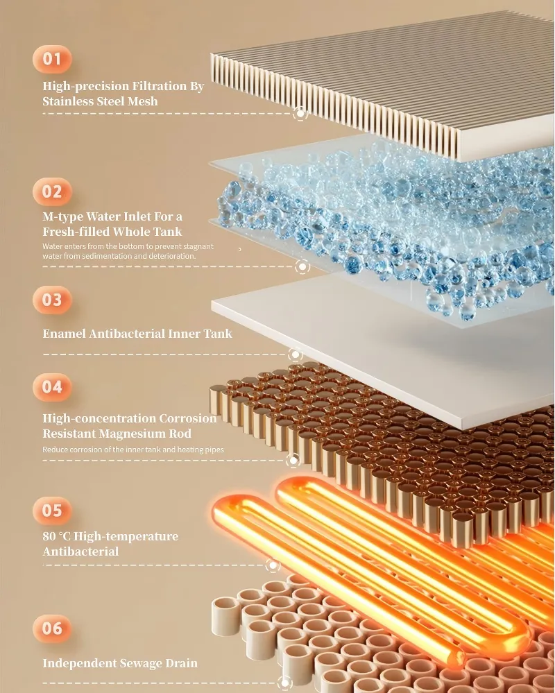 The 6-stage purification system (high-density magnesium rod, enamel tank, 99.99% high-temperature sterilization, etc.) ensures clean, healthy water. Its 8 safety protections (anti-freeze, dry burn prevention, lightning resistance, etc.) and durable enamel tank offer long-term reliability.