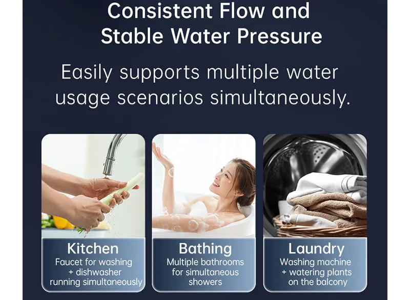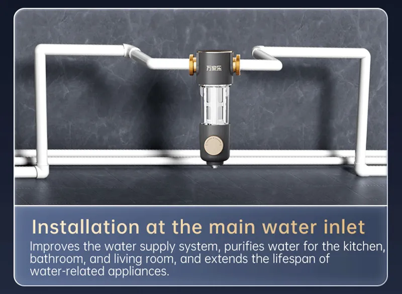 Improves the water supply system, purifies water for the kitchen,bathroom, and living room, and extends the lifespan ofwater-related appliances.