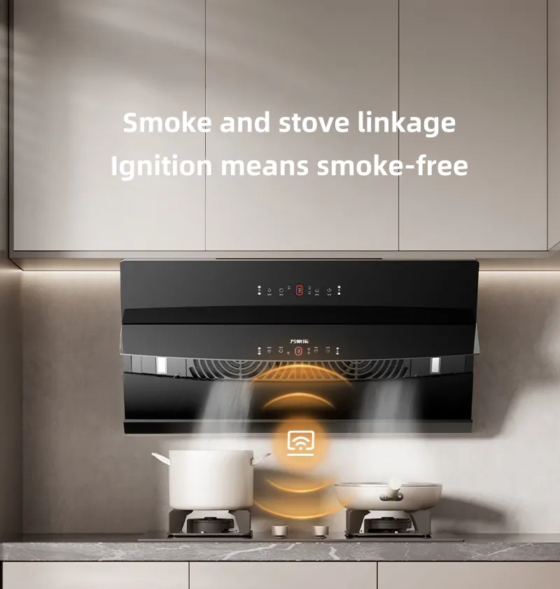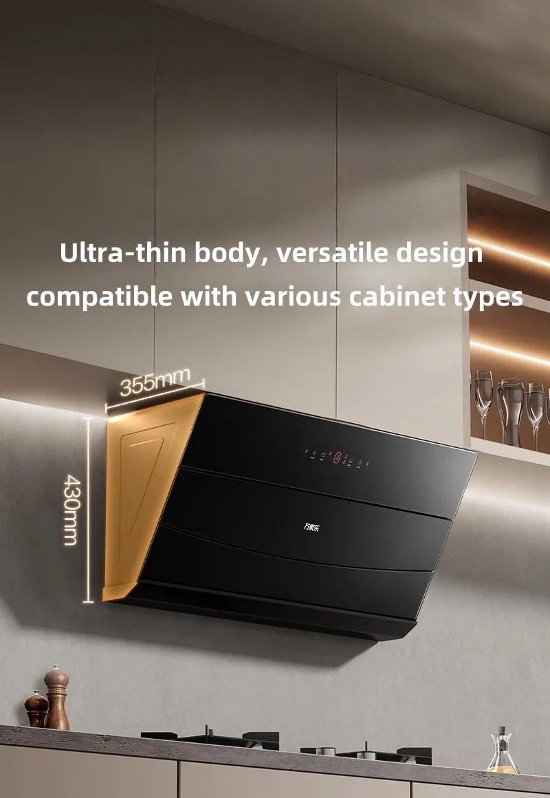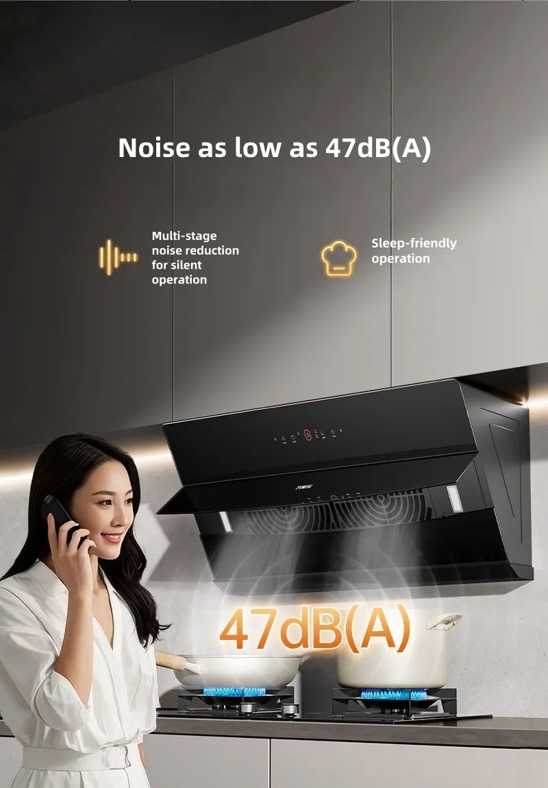 This range hood boasts 25m³ high air volume, 500pa static pressure, and an 896mm smoke barrier for efficient smoke absorption. With smart linkage, nano-coated impeller, and magnetic oil screen, it’s easy to clean. Ultra-quiet (47dB), space-saving (355mm depth), and safe with rounded design. A 1.85L oil cup reduces hassle.