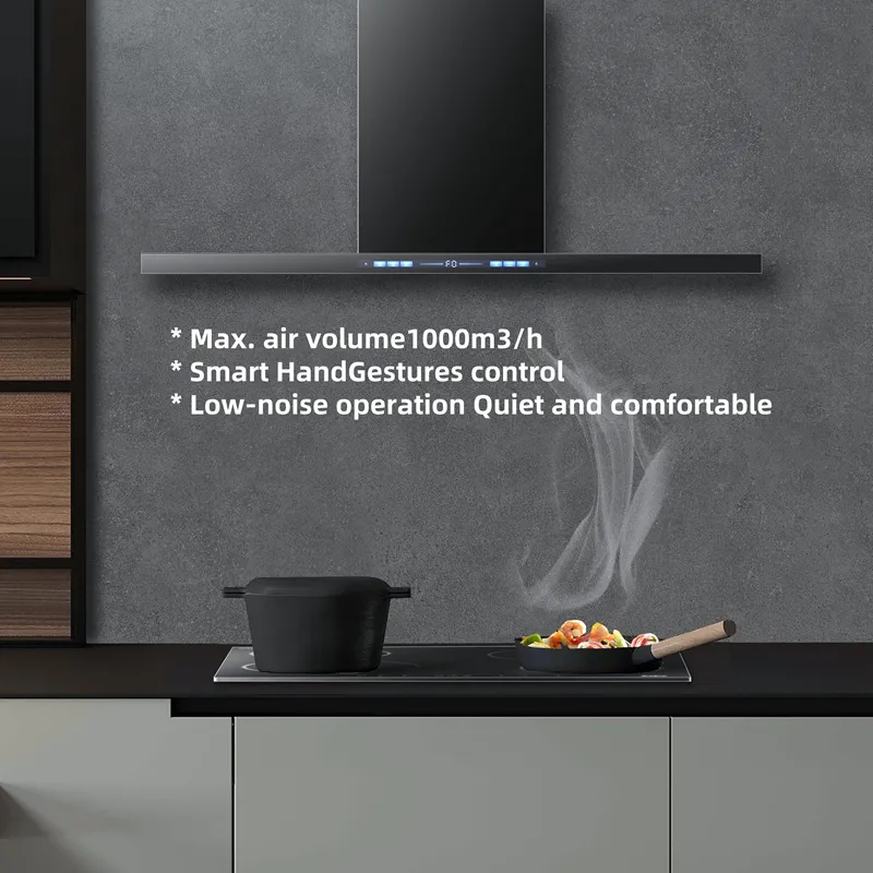 This high-performance range hood combines sensor touch controls with gesture recognition for intuitive operation. The advanced DC motor technology delivers powerful ventilation with 1000m³/h maximum airflow, while operating at just 67dB noise level for quiet kitchen environments.