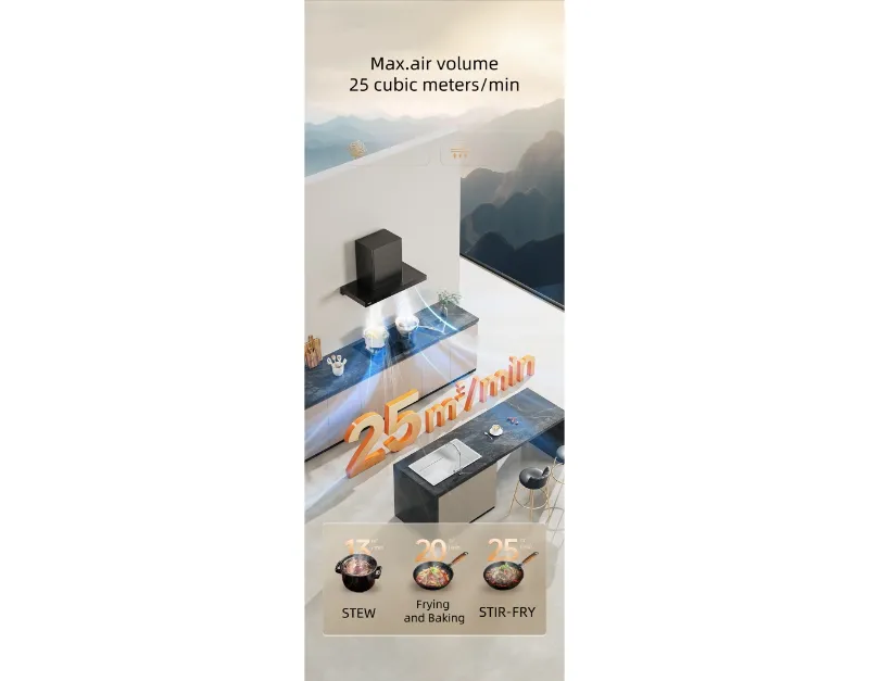 The Range Hood features a nano-coated impeller with smart self-cleaning technology for hassle-free maintenance. Its intelligent suction pressure adjustment automatically optimizes airflow, while the hood-hob linkage ensures synchronized operation with your cooktop. The quick-release suction plate allows for easy cleaning, and convenient functions like delay shutdown, oil reminder, and top lighting enhance your cooking experience.
