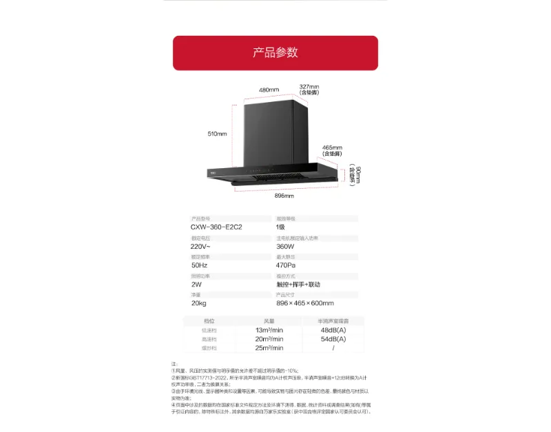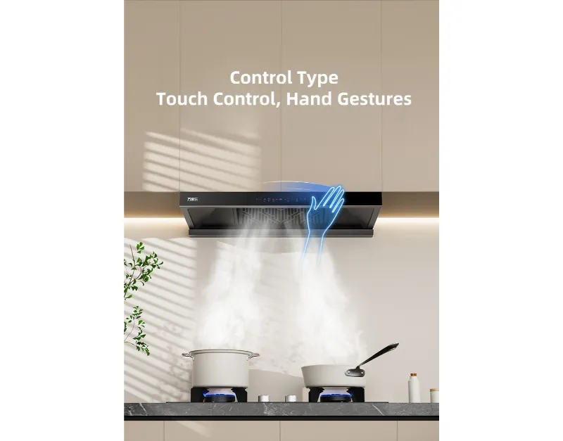 With a 90cm width and 1320m³/h max airflow, it efficiently eliminates smoke and odors while maintaining a quiet 56dB noise level. The sleek tempered glass design adds modern elegance to your kitchen. Control options include touch panel and gesture recognition, with two fan speeds + stir-fry boost mode for flexible ventilation. Powered by a 320W motor, it delivers reliable performance with a standard 180mm chimney diameter.