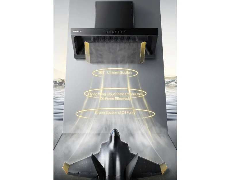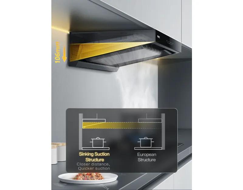 The sinking structure forms a strong negative pressure area and a wide suction area, covering gas hob, quickly absorbing the oil fume, so that the oil fume has nowhere to escape