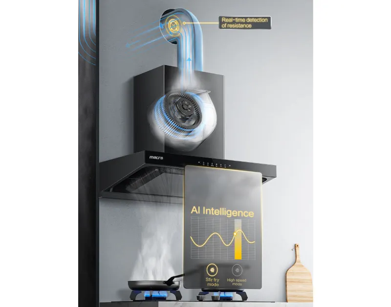 Monitor the real-time resistance of the flue from the source, adjust the motor speed according to the resistance, the greater the resistance, the bigger the wind force. When it's low resistance, the hood will adjust to low speed and silence mode