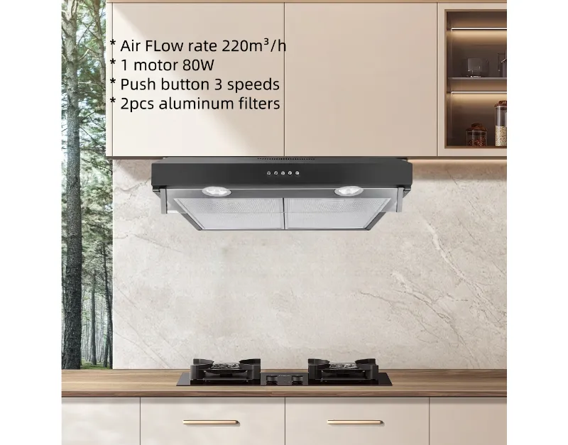 This compact 60cm range hood delivers 220m³/h airflow with remarkably quiet operation at just 50dB, making it ideal for small to medium kitchens. The 80W motor provides energy-efficient performance while maintaining effective ventilation. It features 3-speed push button control for easy adjustment and comes equipped with 2 durable aluminum filters for optimal grease capture.