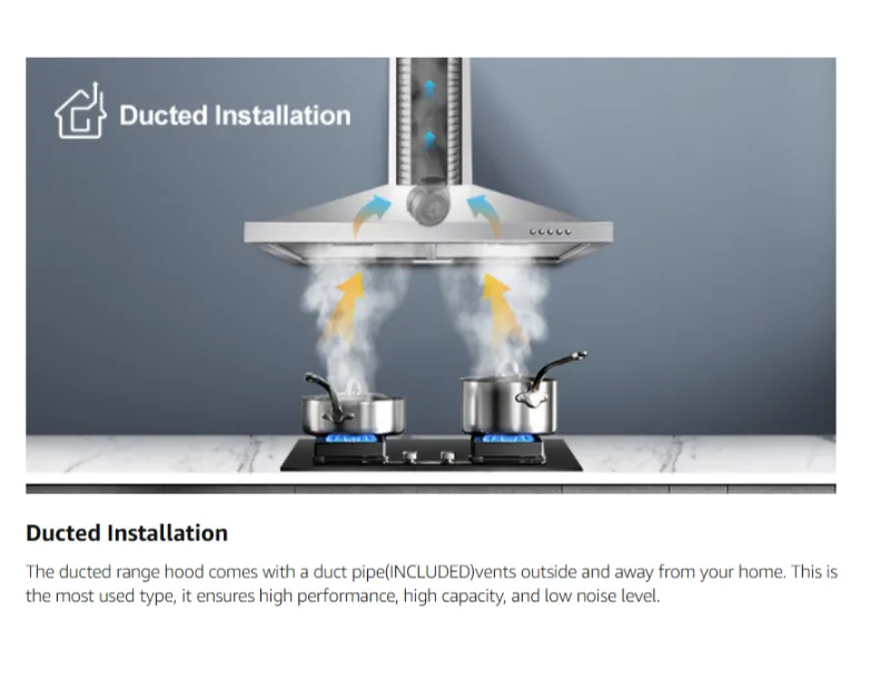 The ducted range hood comes with a duct pipe (INCLUDED) vents outside and away from your home. This is the most used type, it ensures high performance, high capacity, and low noise level.