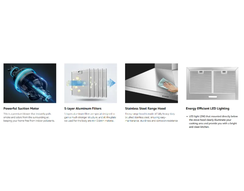 LED light (2W) that mounted directly below the stove hood clearly illuminate your cooking area and provide you with a bright and clean kitchen.
