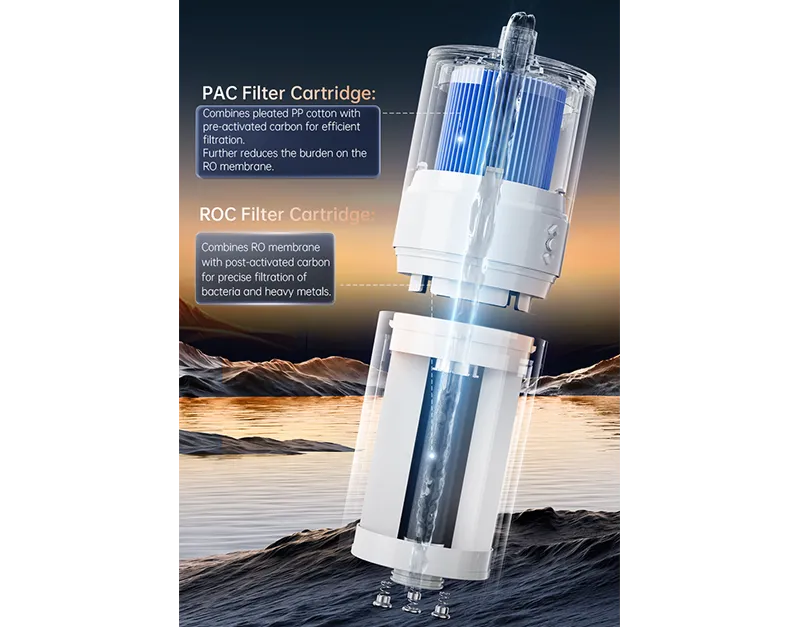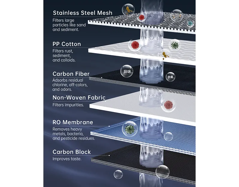 Combines RO membrane with post-activated carbon for precise filtration of bacteria and heavy metals.